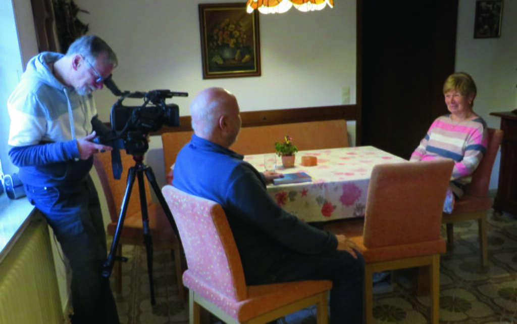 Achtung Aufnahme! Hier wurde Brigitte Herm in der Weinstraße interviewt und erzählte von ihrer langjährigen Tätigkeit in der Ortsverwaltung Eisental. Links Kameramann Rainer Heiland, in der Mitte Bernhard Foos, der das Gespräch führte.