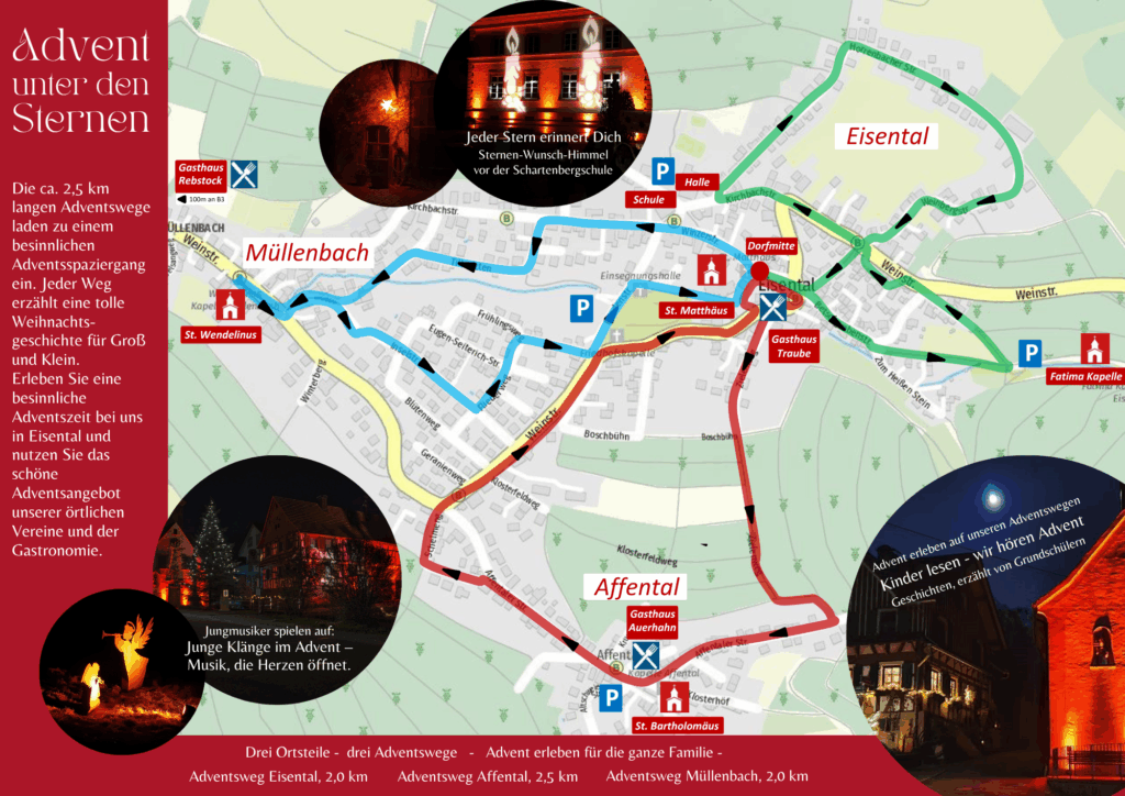 Weihnachtlich dekorierte, ca. 2,5km lange Wanderwege durch Eisental in der Adventszeit.